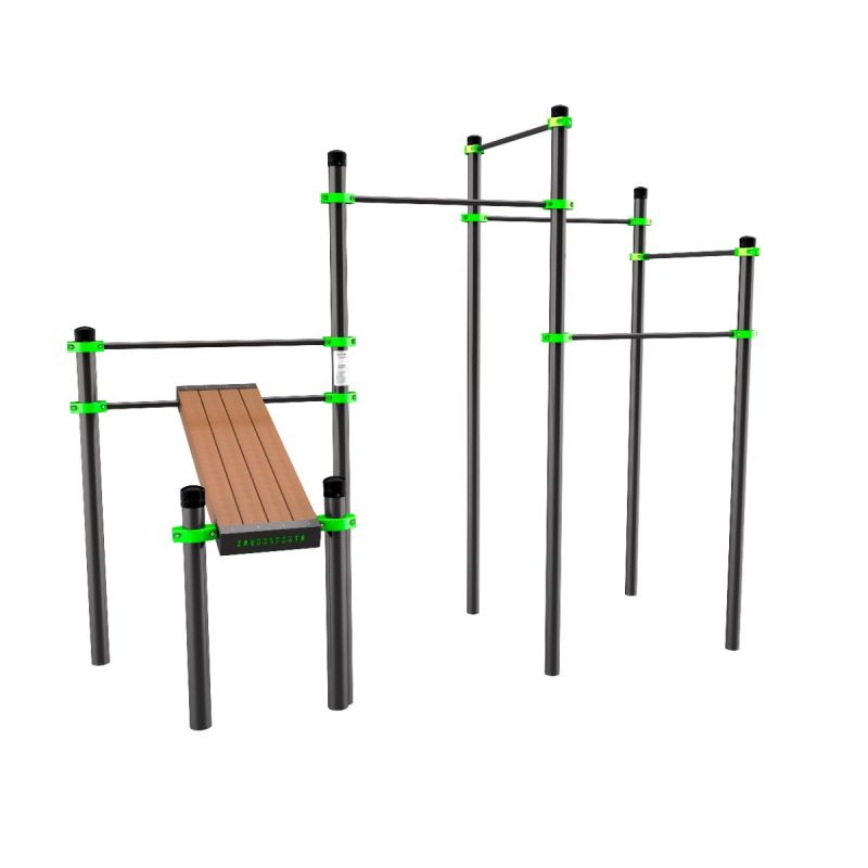 Компактный комплекс с наклонной скамьёй и пятью перекладинами на разных уровнях позволяет выполнять упражнения на пресс, подтягивания и отжимания, сочетая базовые элементы воркаута на одной площадке. Подходит как для самостоятельных занятий, так и для групповых тренировок на уличных спортивных площадках.
