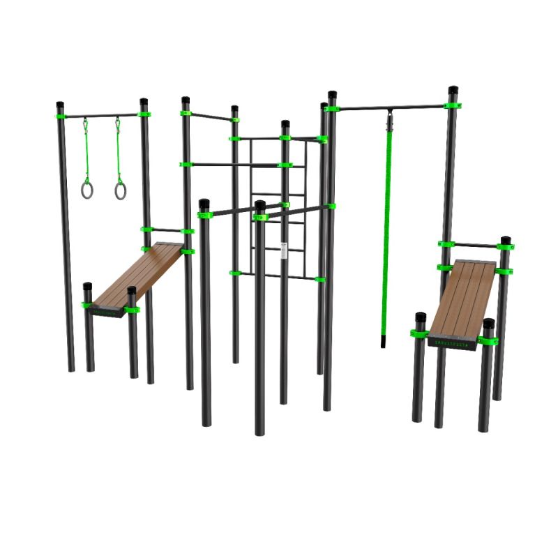 Комплекс сочетает сразу несколько популярных элементов: турники разной высоты, шведскую стенку, брусья, две скамьи для пресса, гимнастические кольца и канат. Он позволяет прорабатывать все основные группы мышц, развивать силу, выносливость, гибкость и координацию. Такая конструкция удобна для организации тренировок сразу для нескольких человек разного уровня подготовки и подойдёт для дворовых площадок, спортивных зон и площадок подготовки к выполнению нормативов ГТО.