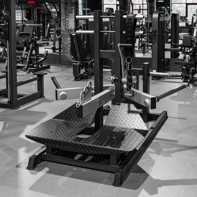Тренажер для приседаний с поясом имитирует «колодец» за счёт погружения груза между двумя платформами для ног. При работе в тренажере со свободными весами основную нагрузку получают ягодичные мышцы, четырехглавые мышцы бедра, икроножные мышцы, при этом минимизирована травмирующая нагрузка на спину и поясницу. Акцент на группу мышц при выполнении упражнения можно сместить при помощи изменения точки крепления. Рычаг для быстрого старта и завершения упражнения позволяет менять точку крепления и нагрузку оставаясь в исходном положении.