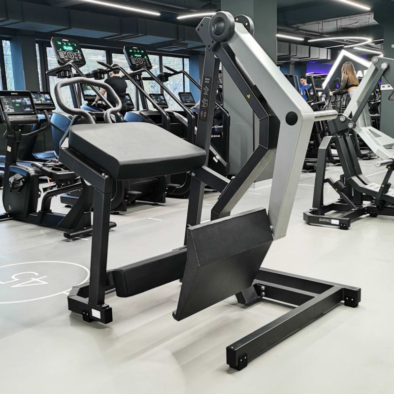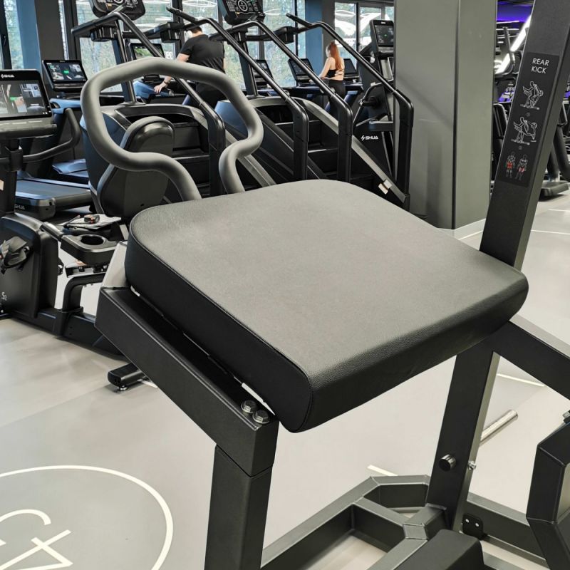 Тренажёр Глют-машина предназначен для изолированной проработки больших ягодичных мышц. Упражнение выполняется поочерёдно каждой ногой, что позволяет акцентировать внимание на целевых мышцах и сбалансировать нагрузку между сторонами. Удобная парта для рук и валик для голени помогают зафиксировать корпус в стабильном положении, а платформа для толчка, оборудованная листами из нержавеющей стали, обеспечивает надёжное сцепление и безопасное движение.